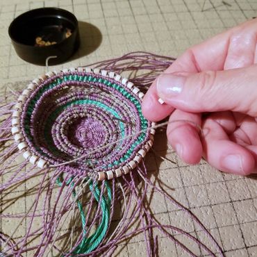 knotted and twined waxed poly cording, cotton yarn, cotton twine, beads of glass, wood & ceramic on carved and painted pine plywood, felt backing on base.