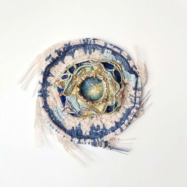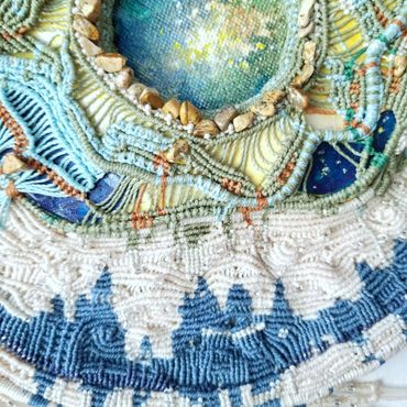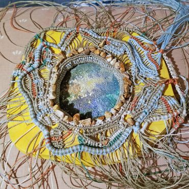 waxed poly cording (knotting), carved, painted plywood, clear glass beads, metal hoop