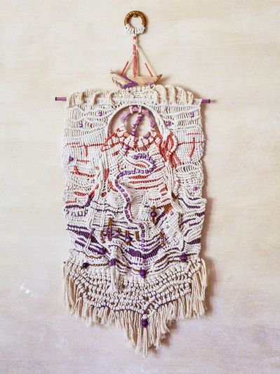 Carved and painted pine plywood, knotted waxed poly-cording, stained wood beads.